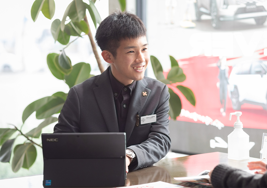 私のお仕事は、お客様のカーライフに寄り添い、「車をネッツトヨタ瀬戸内にお願いしたい」と、お店を利用していただけるようにサポートすることです。お客さまから感謝のお言葉をいただいた時や信頼関係が築けたと感じた時に大きなやりがいを感じます。